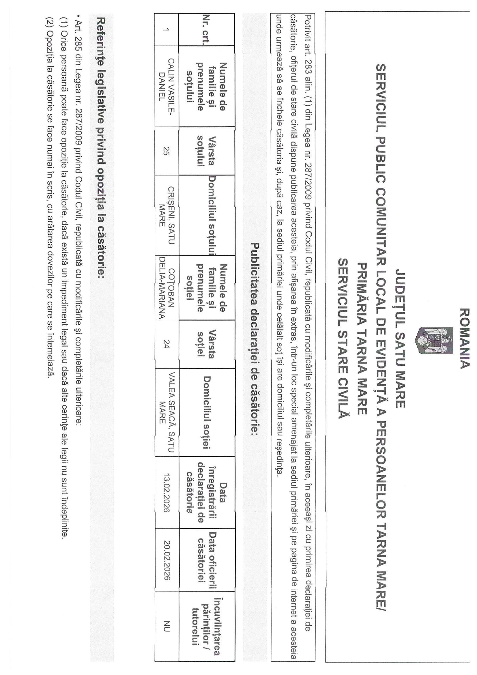 Publicație de căsătorie CALIN VASILE- DANIEL și COȚOBAN DELIA- MARIANA